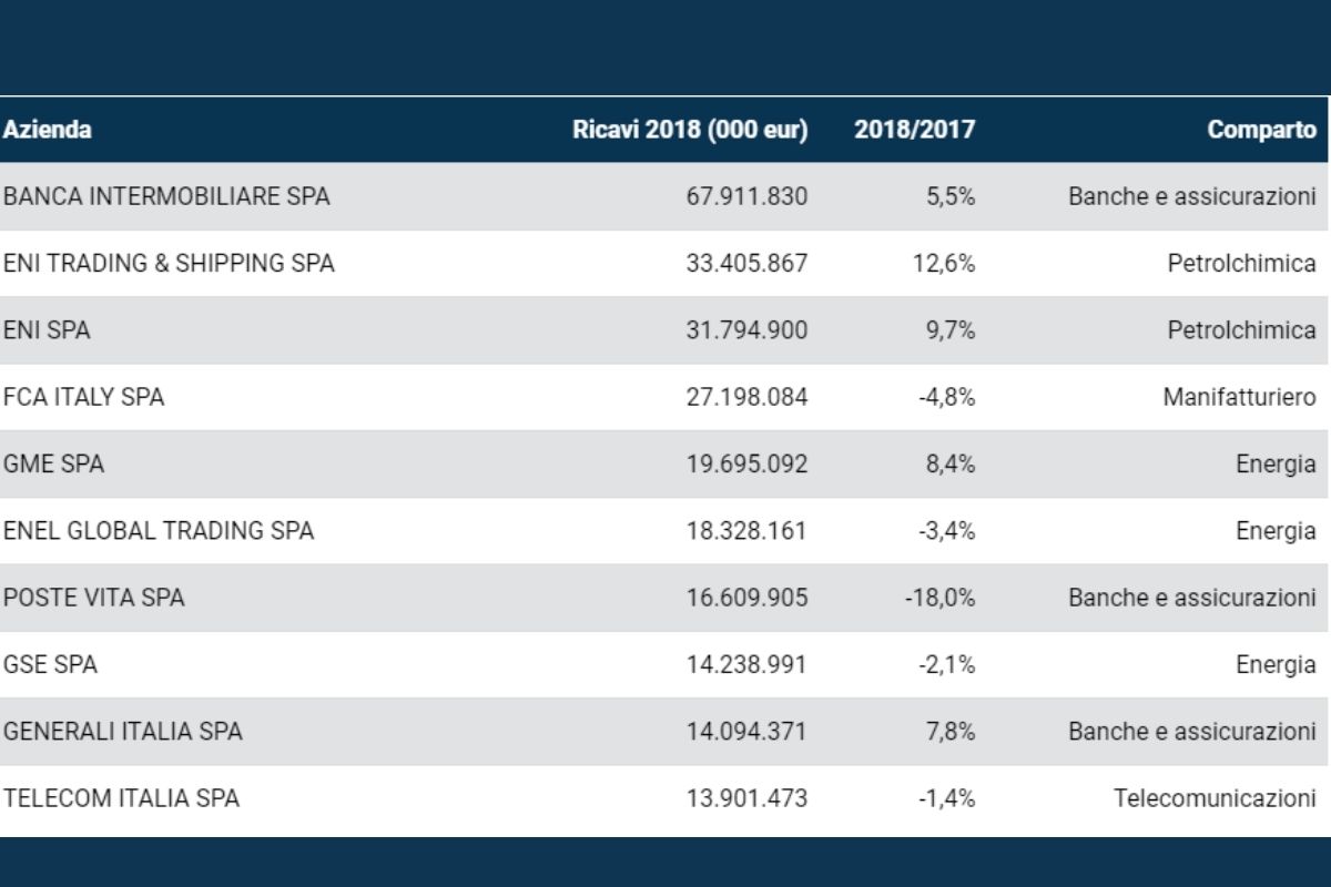 Monitor Italia realizza ogni anno la classifica delle aziende italiane che superano il miliardo di euro, come da bilancio civilistico italiano. Nell’elenco quindi non sono comprese le filiali di multinazionali estere.