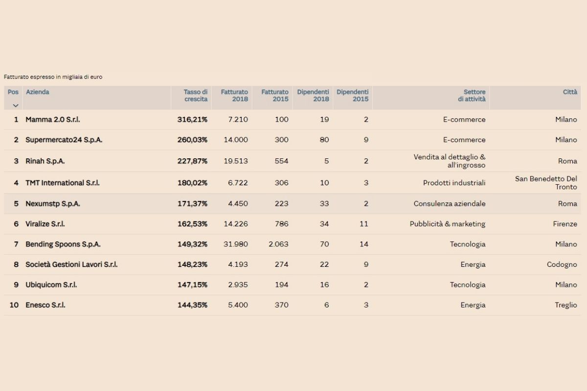 Dal 2019 il Sole24Ore insieme a Statista realizza un elenco delle aziende che hanno ottenuto la maggiore crescita di fatturato nel triennio precedente. L’indagine si basa sull’autocandidatura delle imprese, che devono rispettare però determinati criteri.